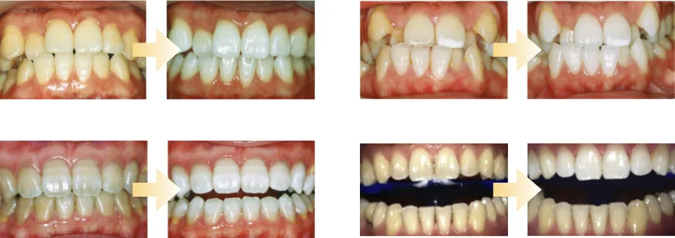 4つの症例のうち、右下は当院理事長の歯列写真です。比較しやすくするため上の歯のみ施術しております。