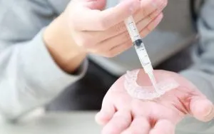 マウスピース内面のスポットに薬剤を米粒程度ずつ注入し、お口に装着します。